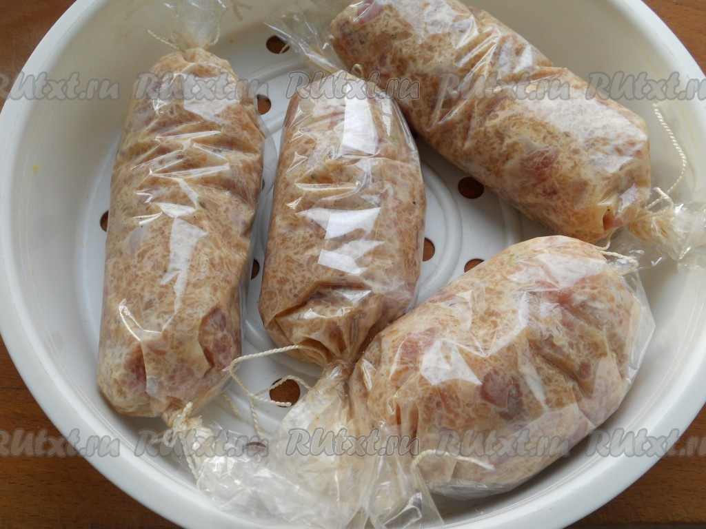 Поместить полуфабрикат в чашу мультиварки для готовки на пару или в пароварку. Если нет ни того, ни другого - просто варите колбаски в кастрюле, в воде.