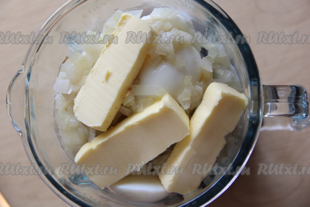В чашу блендера поместить куриную печень, лук, масло и яйца. Добавить соль и перец по вкусу.