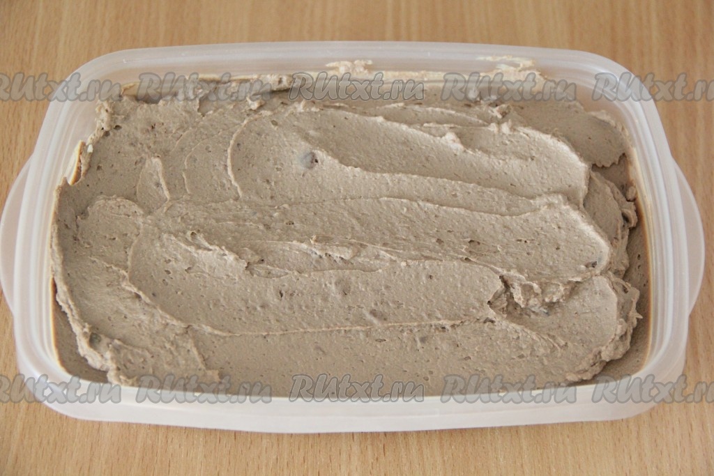 Измельчить все ингредиенты на высокой скорости до однородного состояния. Переложить получившийся печеночный паштет в пластиковый лоток и закрыть плотной крышкой.