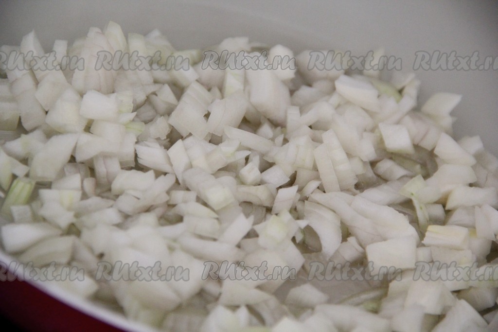 Лук почистить, порезать мелкими кубиками и обжарить на сливочном масле до мягкости.