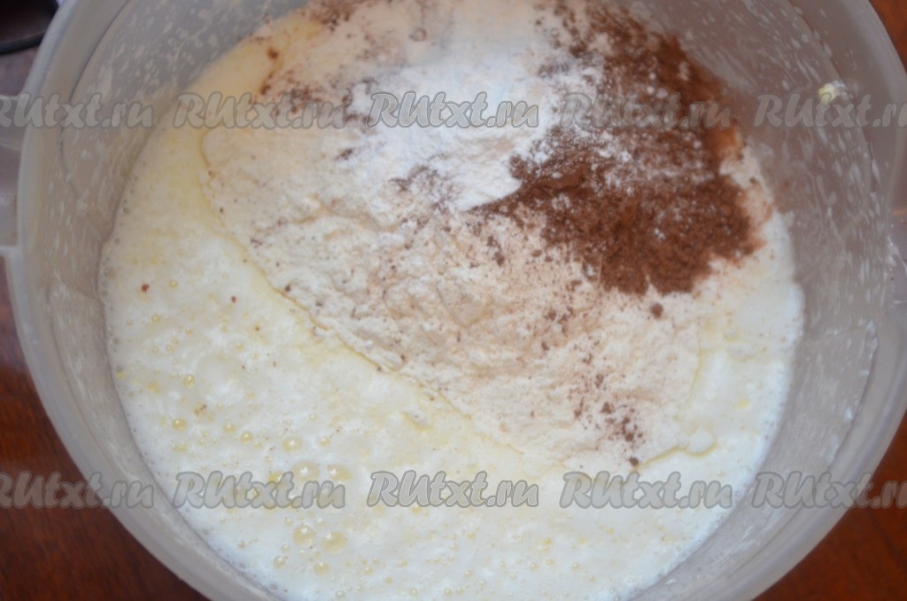 Просеять в тесто часть муки, какао-порошок и разрыхлитель, перемешать лопаткой. Постепенно добавляя оставшуюся муку и тщательно вмешивая её в тесто, замесить однородное тесто, напоминающее по консистенции сметану средней густоты.