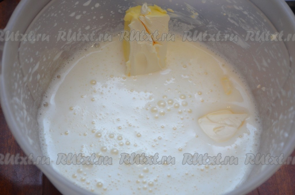 Добавить молоко и сливочное масло комнатной температуры, взбить миксером до однородности.