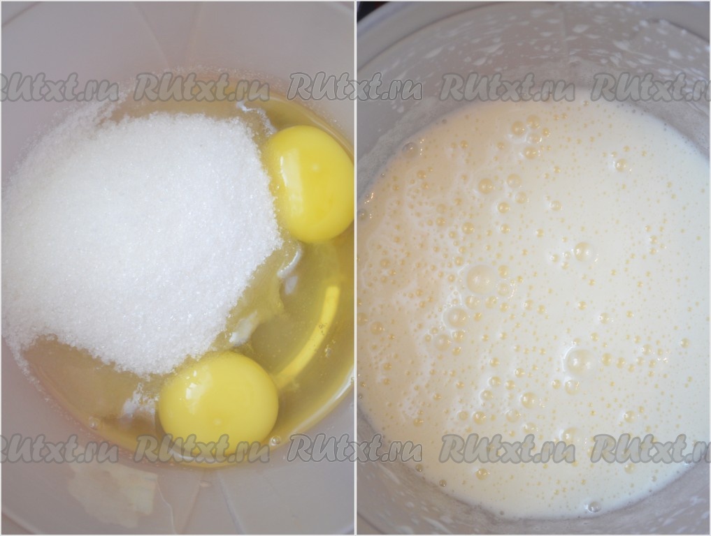 Яйца взбить с сахаром миксером в течение 5 минут (яичная масса посветлеет и увеличится в объёме).