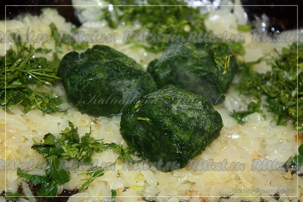 К луку добавить шпинат, порезанную зелень, специи, довести до готовности в течение 2-3 минут.