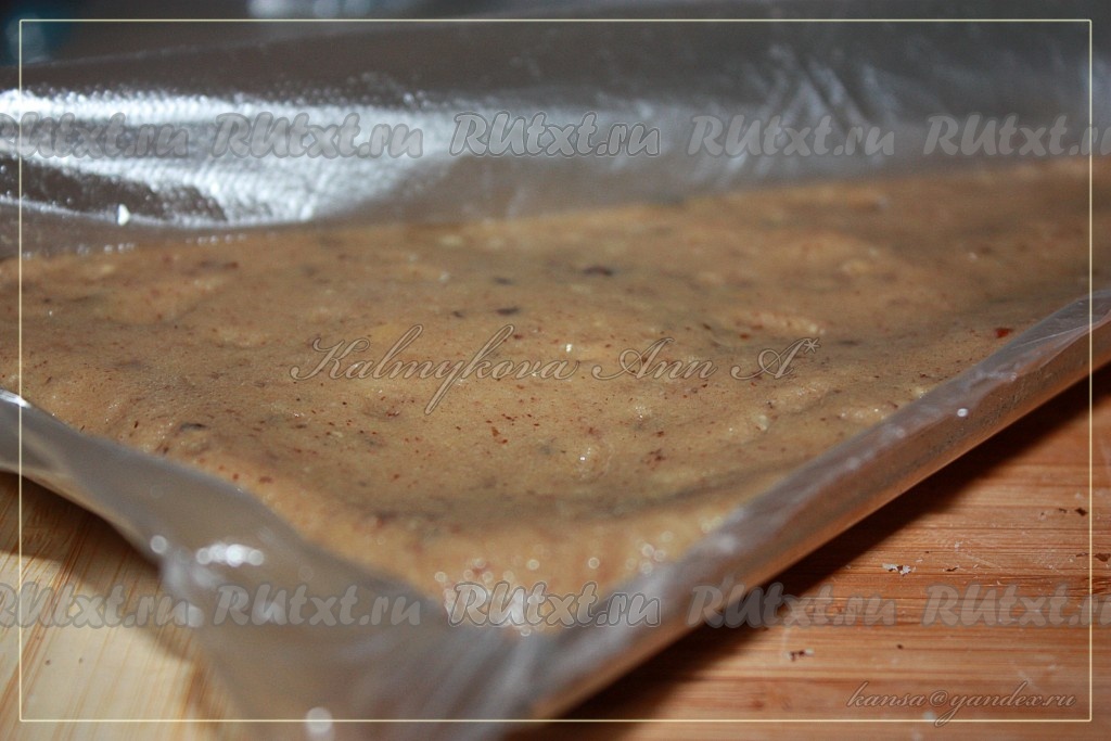 Произвольно, как пожелаете, сформировать полученную массу (я делала пласт на пищевой пленке) и убрать в морозилку минимум на час.
