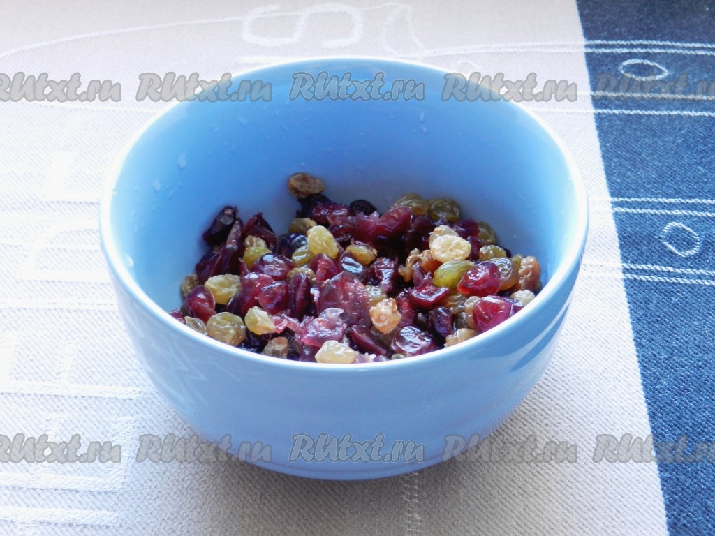 Изюм и вяленую клюкву промыть, залить кипятком и оставить на 30 минут. Затем откинуть на сито, слить воду. Выложить на бумажное полотенце и обсушить.