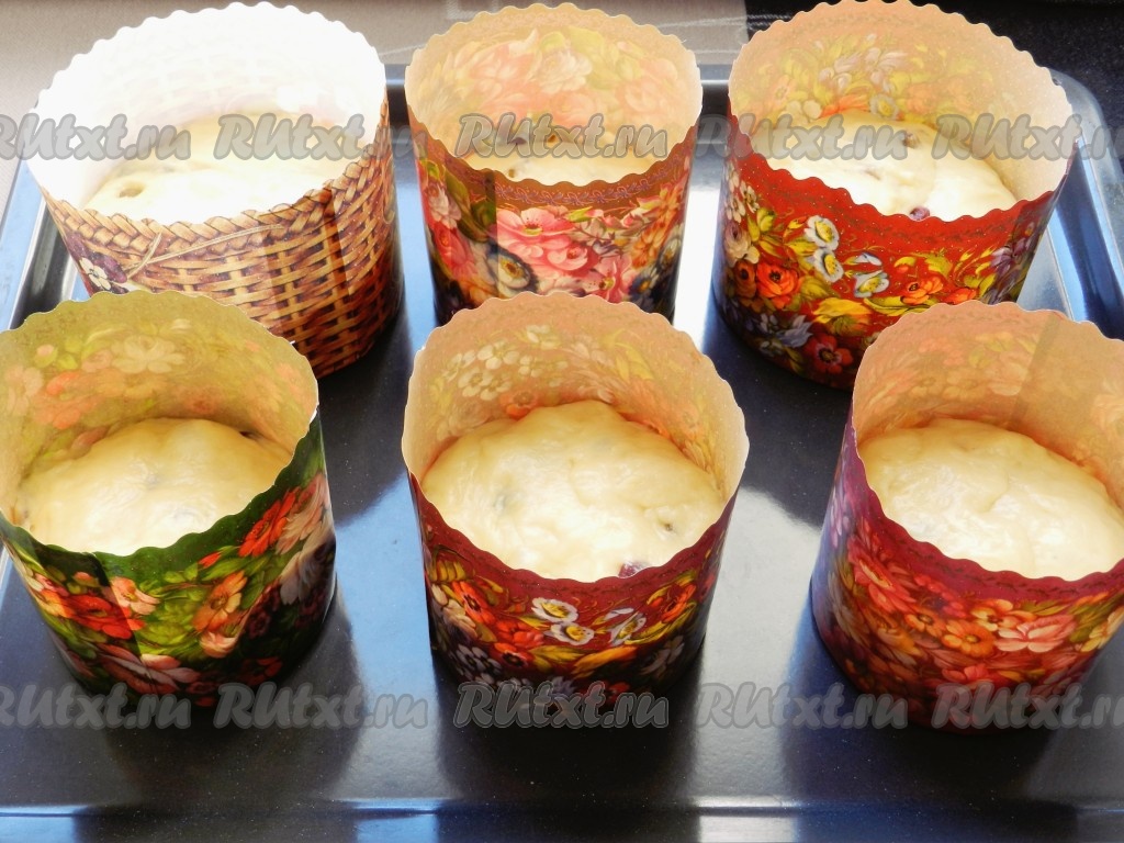 Готовое тесто разложить по формочкам, заполняя их на 1/3 объема. В этот раз я использовала специальные бумажные формы для выпечки и не смазывала их маслом. Формы поставить на противень, накрыть чистым полотенцем и оставить еще на 30 минут.