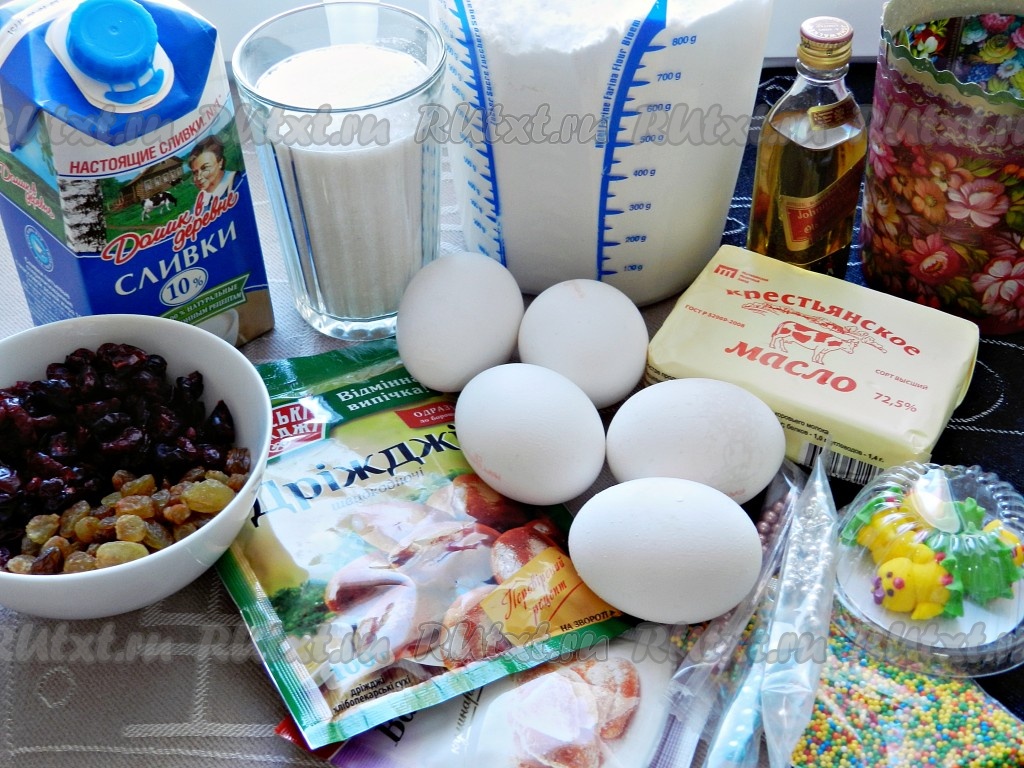 Пасхальные куличи - неотъемлемый атрибут главного праздника весны. Рецептов куличей очень много, все они по-своему хороши. Я сегодня приготовила куличи на сливках. Они получились очень пышными, мягкими, с приятным нежным вкусом. В качестве добавок можно использовать цукаты, вяленые ягоды, орехи. Мне очень понравилось сочетание вяленой клюквы и изюма. Алкоголь в тесто добавлять очень желательно. Кроме того что у выпечки появляется особенный аромат, алкоголь разрыхляет тесто, делая его более воздушным.