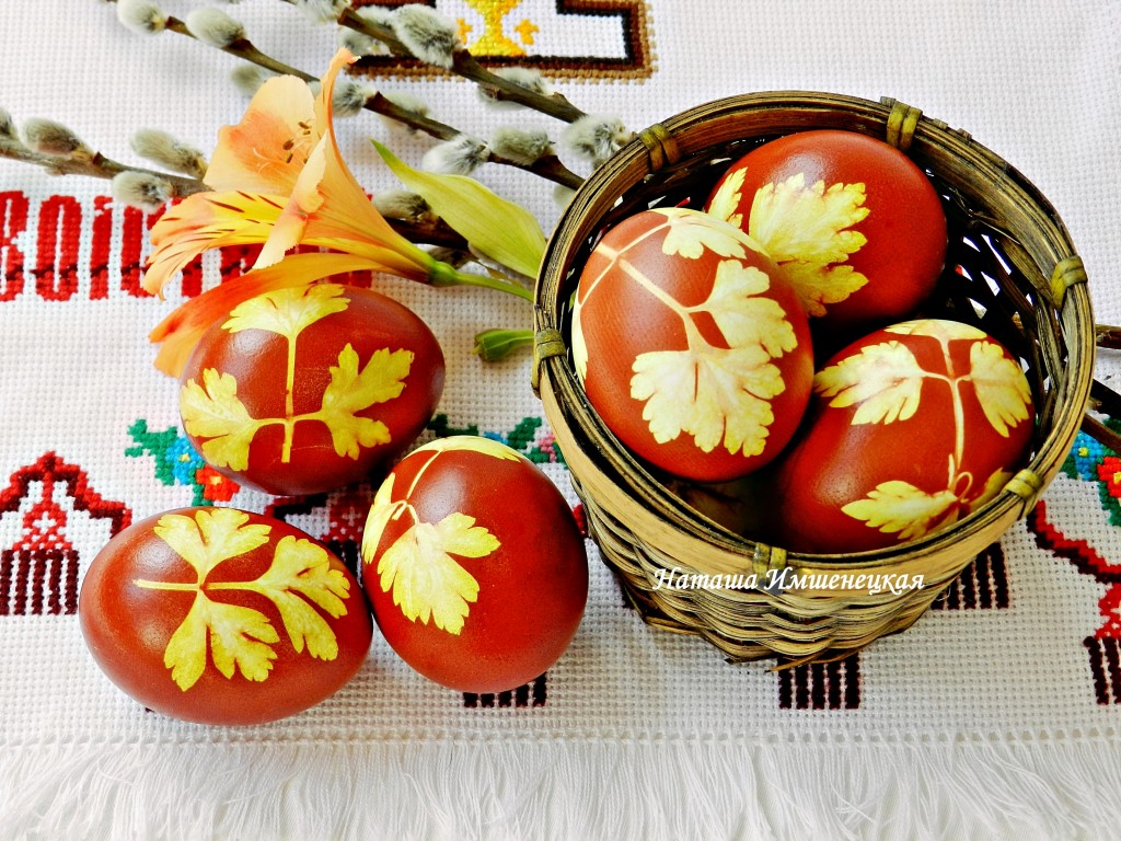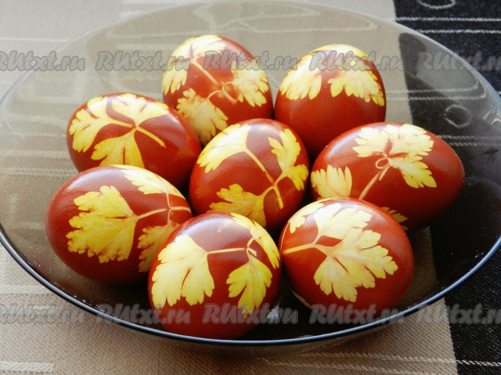 Яйца на Пасху я предпочитаю окрашивать традиционным способом - в луковой шелухе. Приятный красно-коричневый цвет получается насыщенным, ярким, радует глаз. Для разнообразия можно сделать аппликации из веточек петрушки, будет оригинально и красиво.