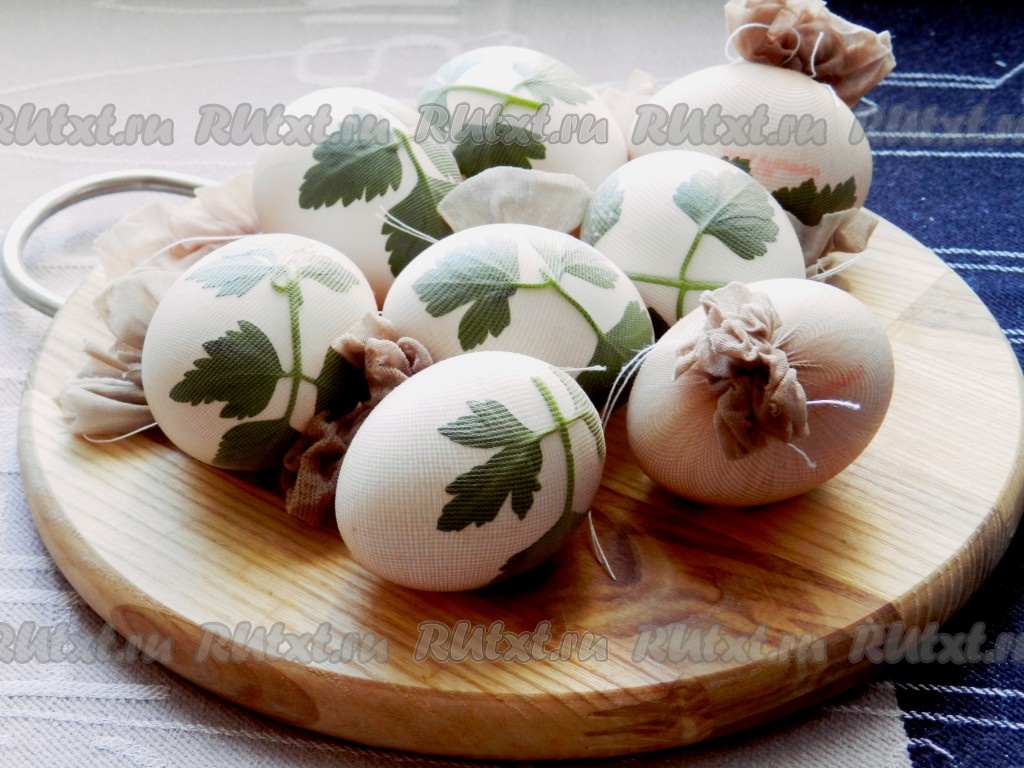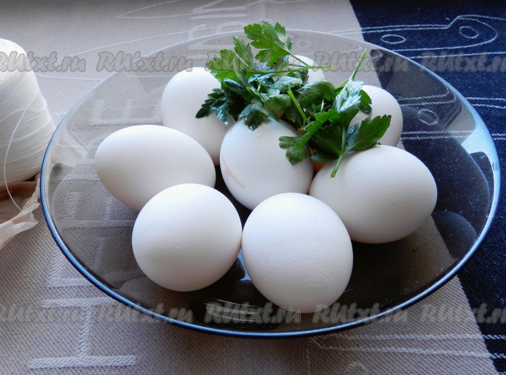 Затем вытащить, обдать холодной водой, срезать ткань, удалить петрушку. Чтобы яйца имели привлекательный блестящий вид, обтереть их руками, смазанными небольшим количеством растительного масла.
