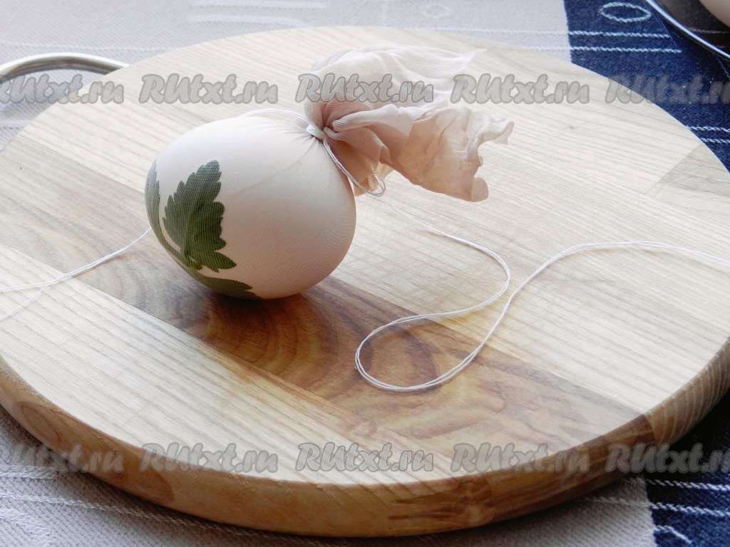 Плотно обернуть яйцо капроновой тканью, натянуть, чтобы листик не двигался и крепко связать нитью концы ткани.