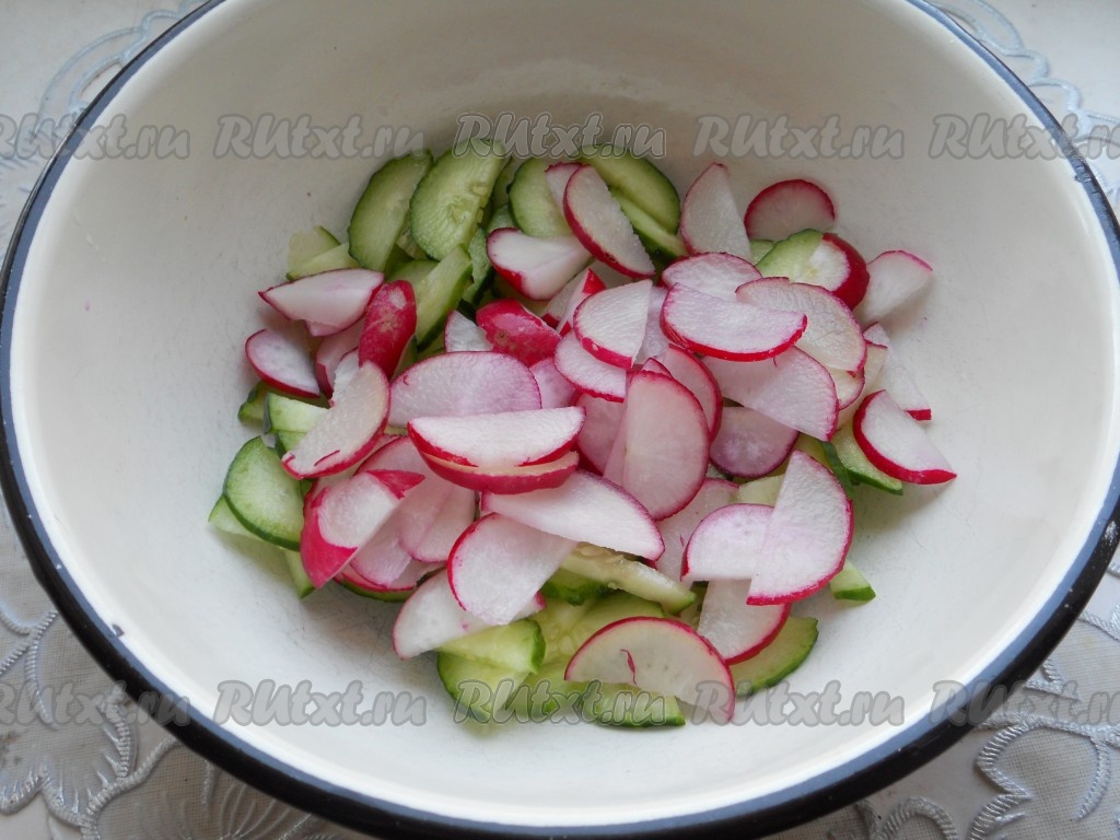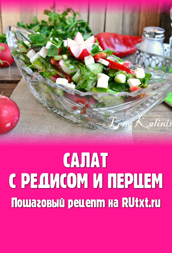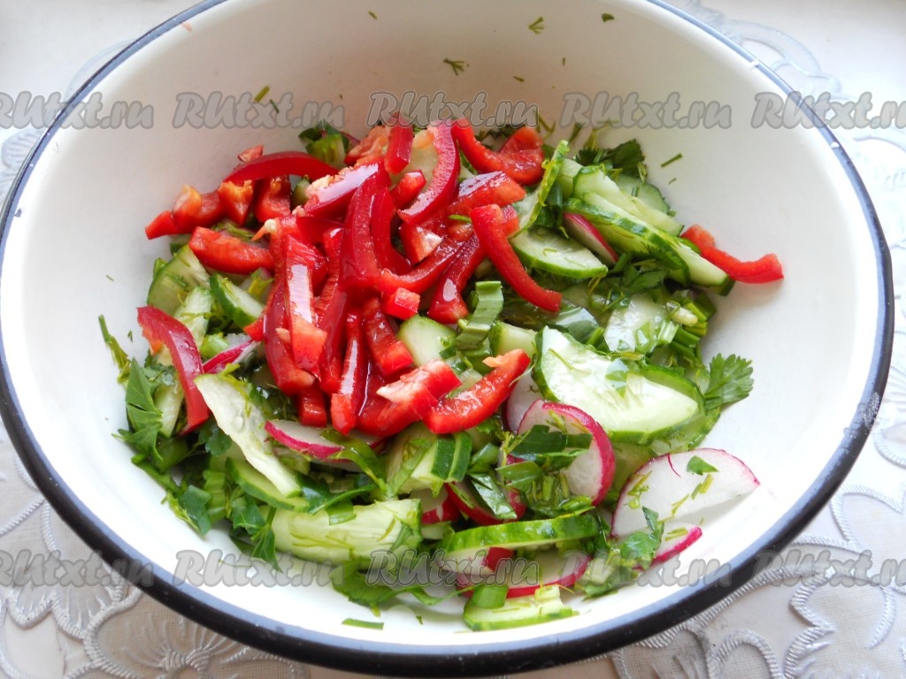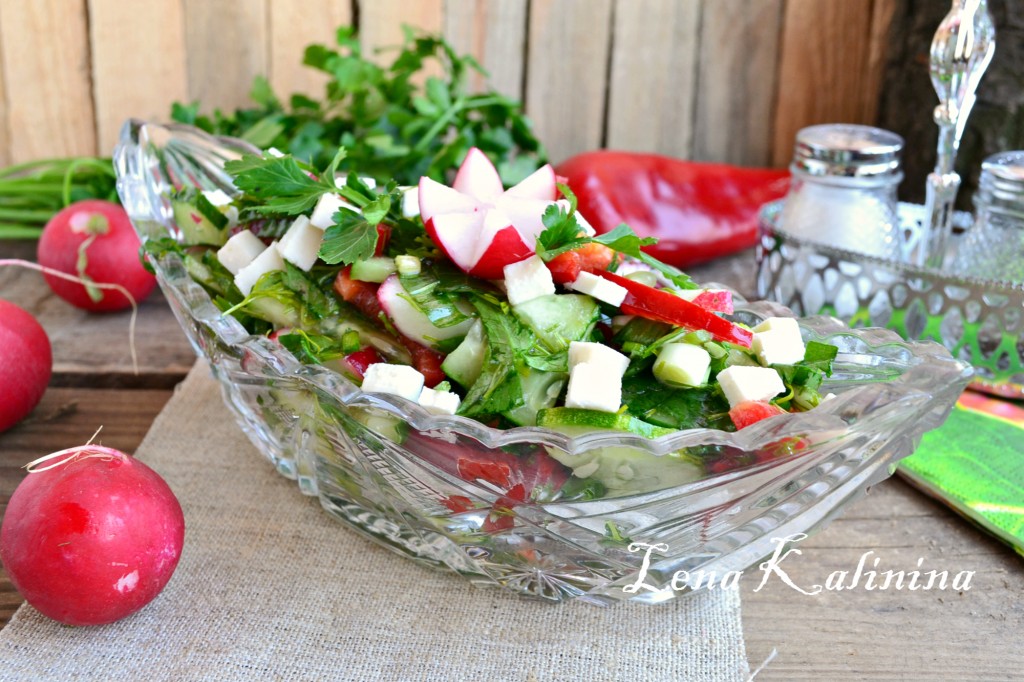 Весной так хочется порадовать себя и близких свежими овощами и большим количеством зелени. Предлагаю приготовить замечательный, очень вкусный и полезный салат с редисом, болгарским перцем и огурцом. Сверху я еще украсила салат кубиками брынзы - отлично получилось!