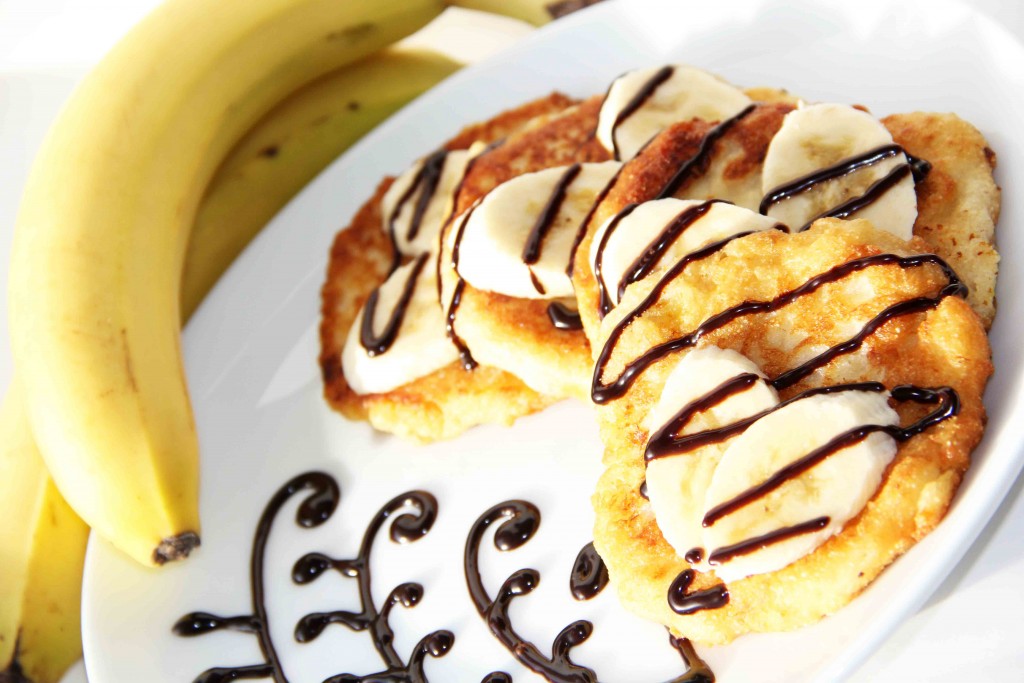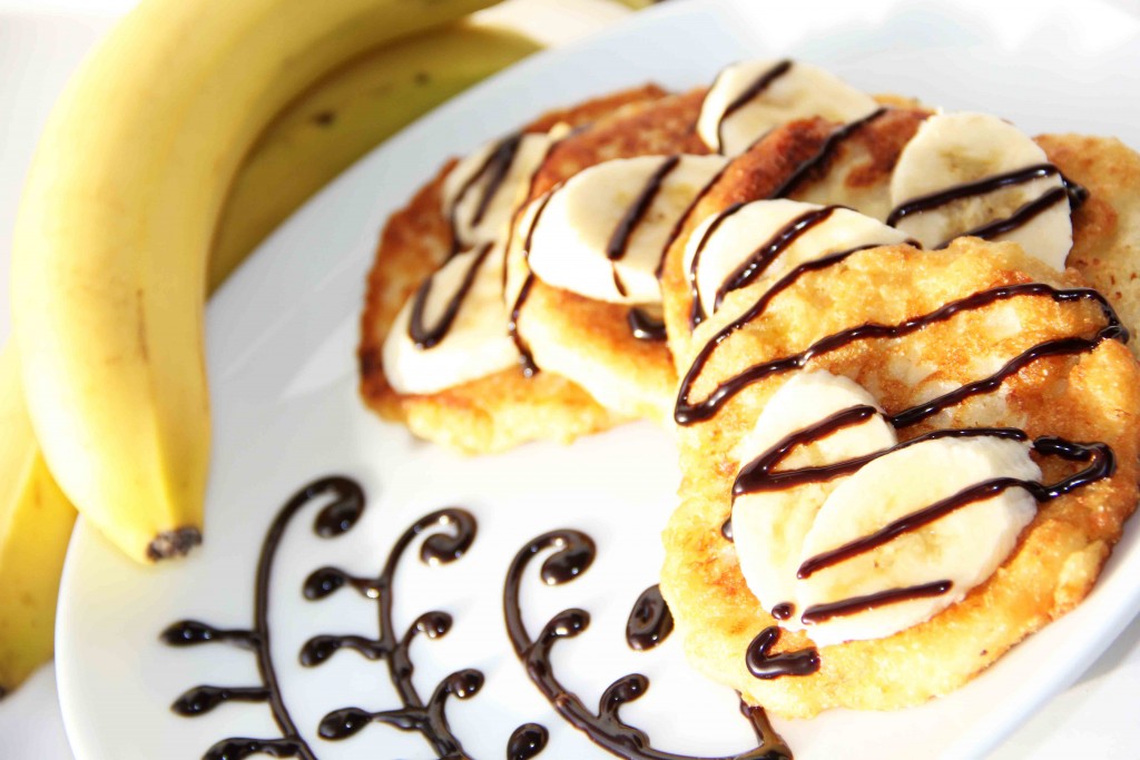 Аппетитные, вкусные сырники, приготовленные с овсянкой, бананом и манкой без добавления муки, к столу подать с пылу с жару. Я украсила сырники кусочками банана и полила сверху шоколадным сиропом.