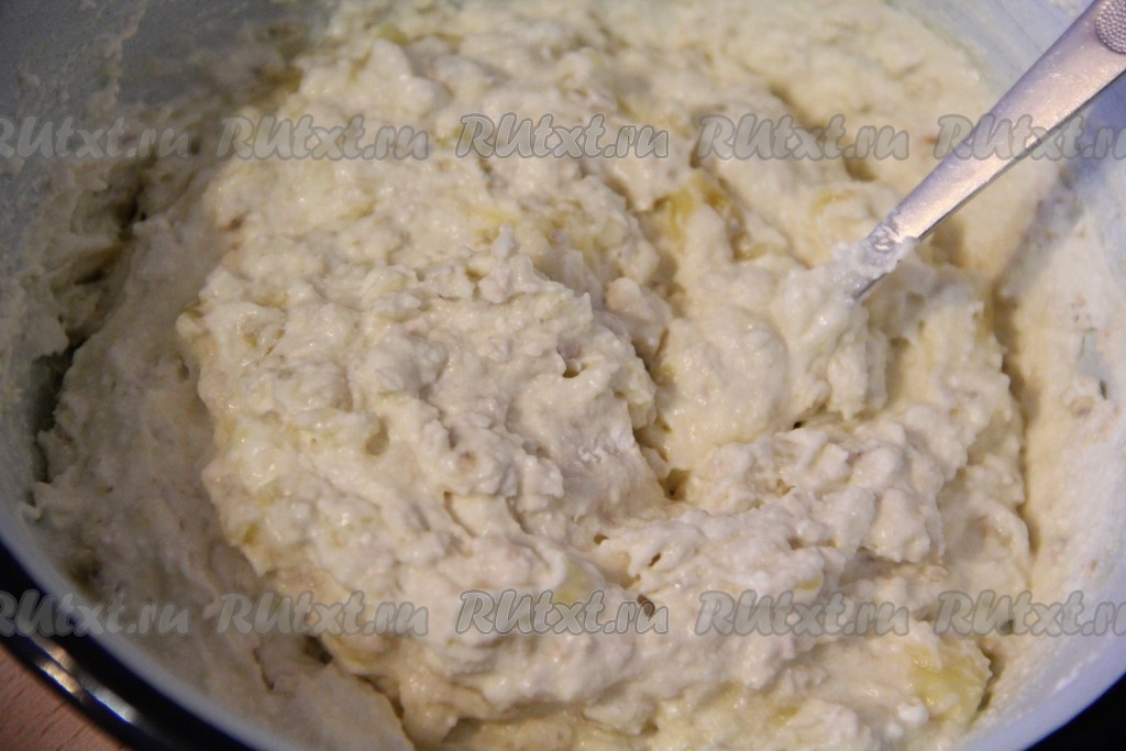 Добавить банан в творожно-овсяную массу, перемешать. Масса для сырников получится не очень густой, чуть гуще, чем тесто на оладьи.