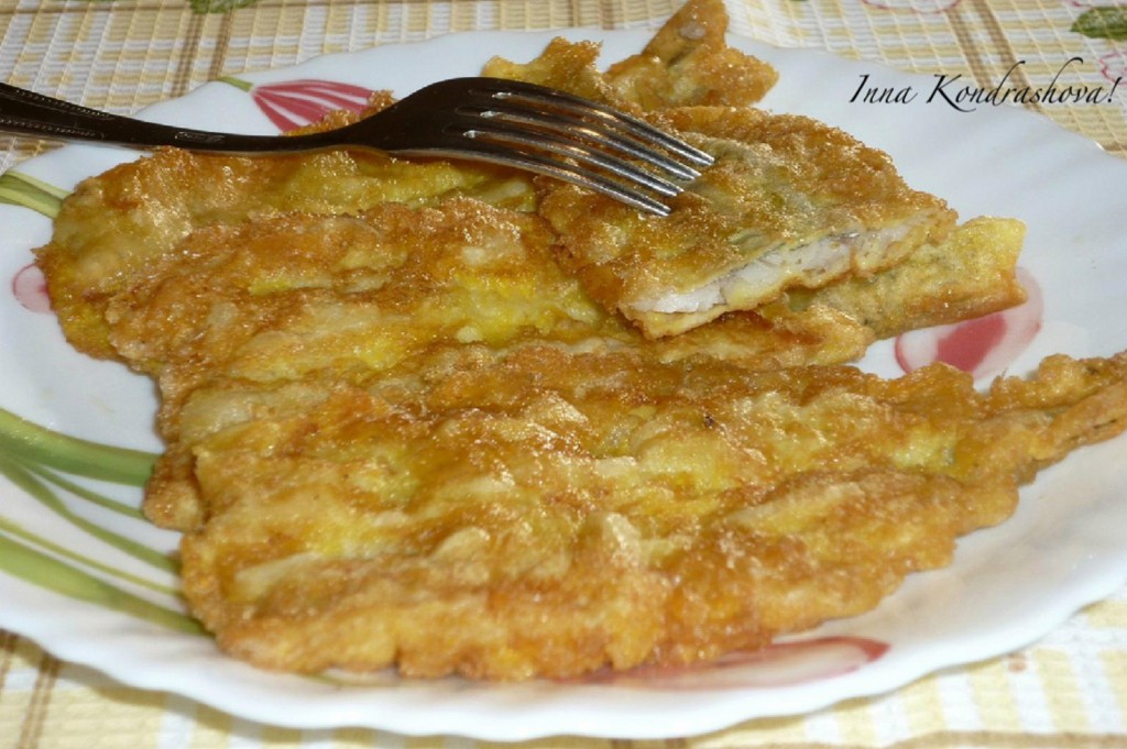 Вкусную, нежную жареную мойву подать с гарниром к столу. Благодаря кляру, рыбка получается очень аппетитной.