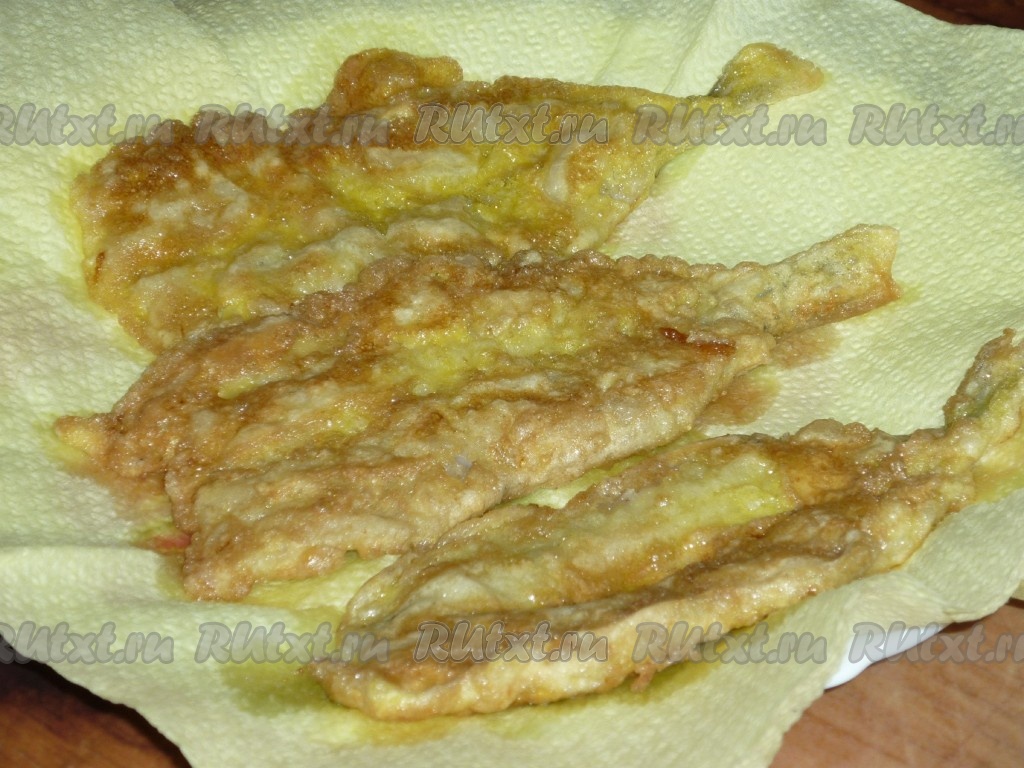 Мойву, жареную в кляре, со сковороды выкладывать вначале на бумажное полотенце, чтобы избавиться от лишнего жира, а затем перекладывать на тарелку для подачи.