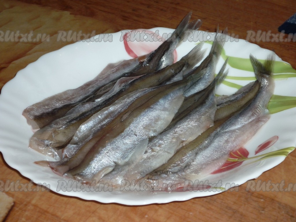 Мойву разморозить, очистить, удалив голову и внутренности вместе с хребтом, отрезать плавники. Получившееся филе промыть водой, обсушить, выложив на бумажное полотенце.