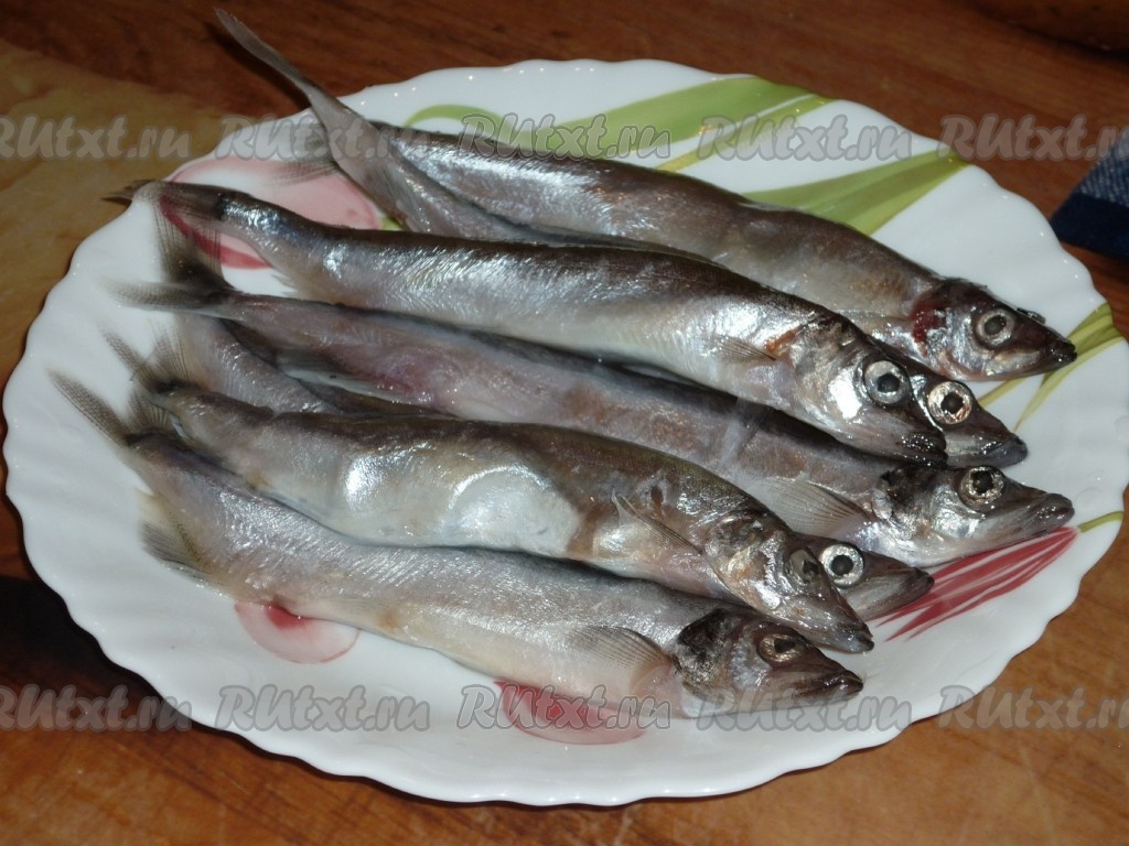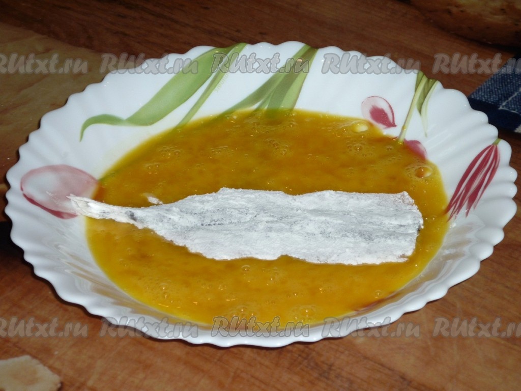 Затем поместить мойву в яичную смесь одной стороной, затем - другой (каждая рыбка должна быть полностью покрыта яичным кляром).