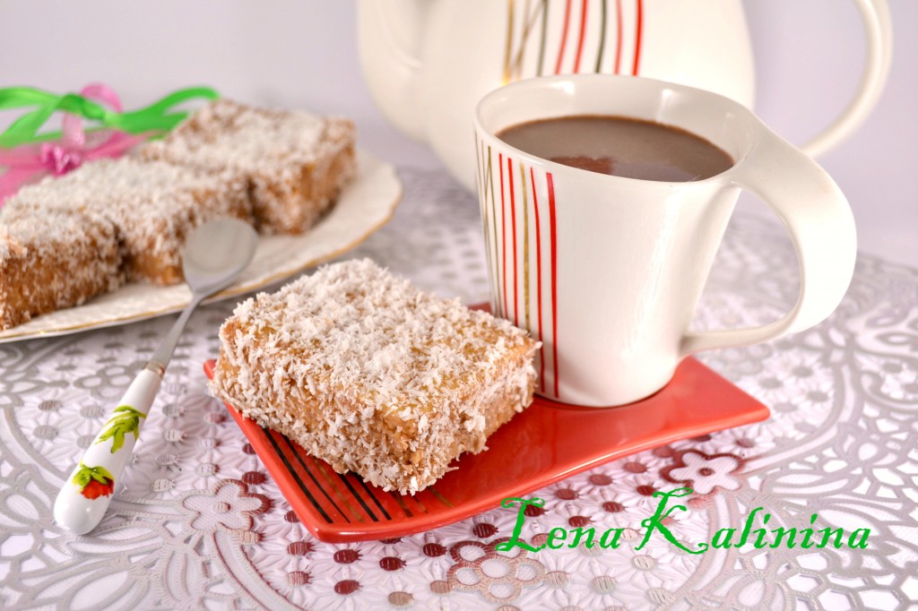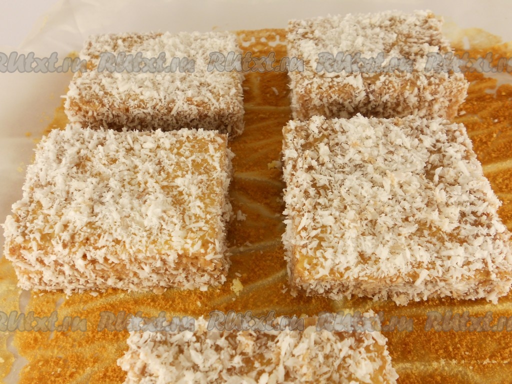 После чего обвалять бисквит со всех сторон в кокосовой стружке. Поместить пирожные в холодильник на 30-40 минут.