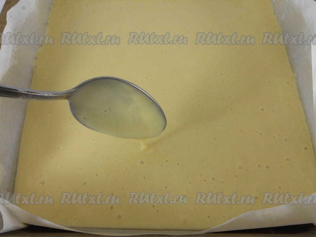 Тесто должно получиться, как сметана средней жирности. Вылить тесто в прямоугольную или квадратную форму для выпечки (у меня форма размером 20 на 22 сантиметра), застеленную пергаментом. Если не уверены в качестве пергамента, можно предварительно его смазать тонким слоем растительного масла.