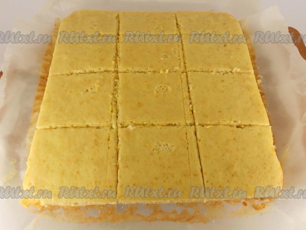 Дать бисквиту немного остыть, снять пергамент. Разрезать бисквит на 12-16 частей.