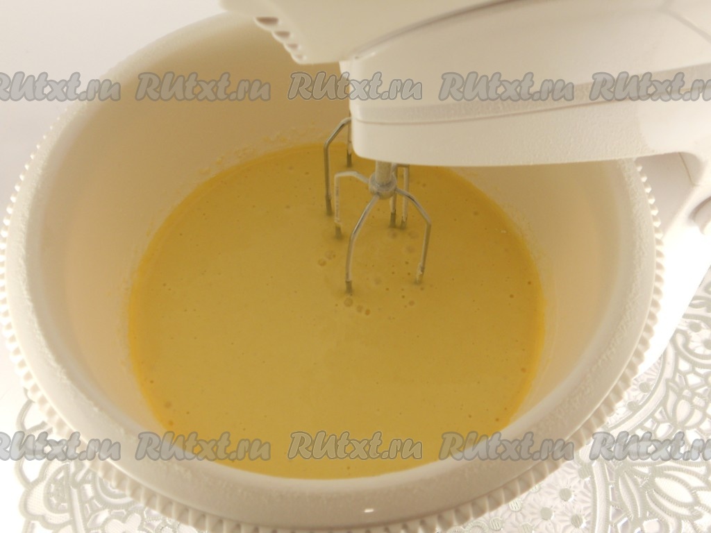 Взбить яйца с сахаром и солью на высокой скорости миксера до побеления и увеличения в объёме (взбивать примерно 5 минут).