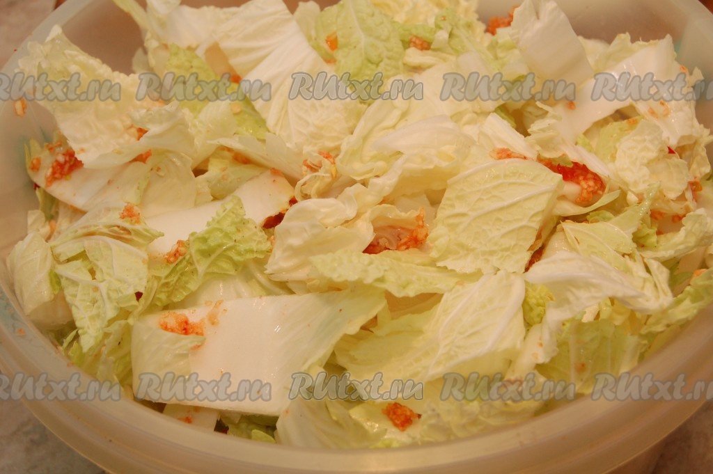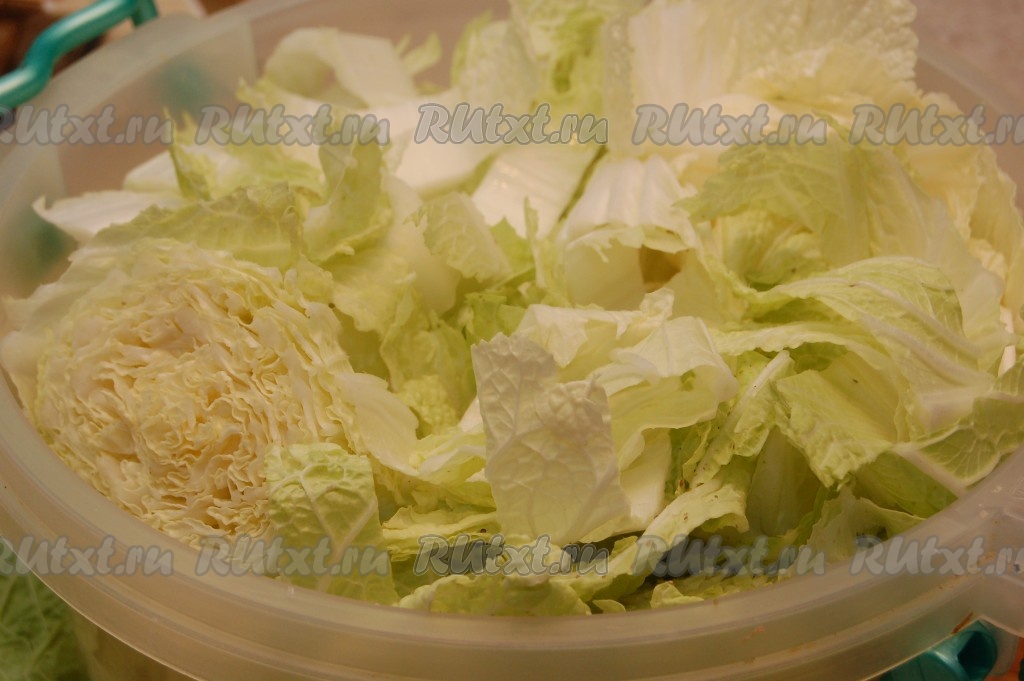 Нарежем пекинскую капусту достаточно крупными кусочками.