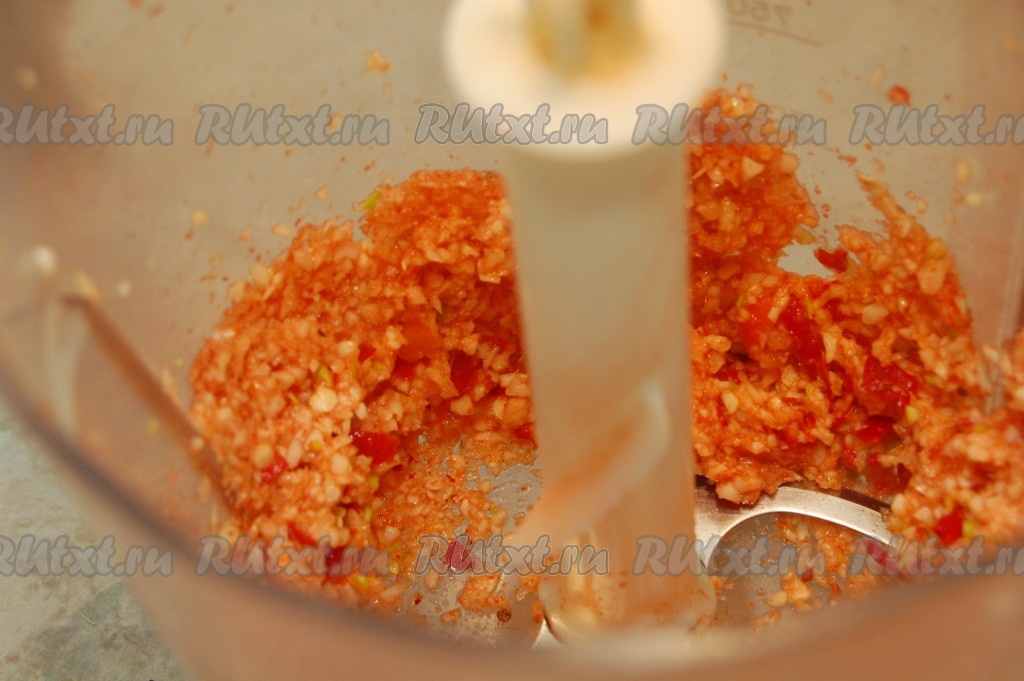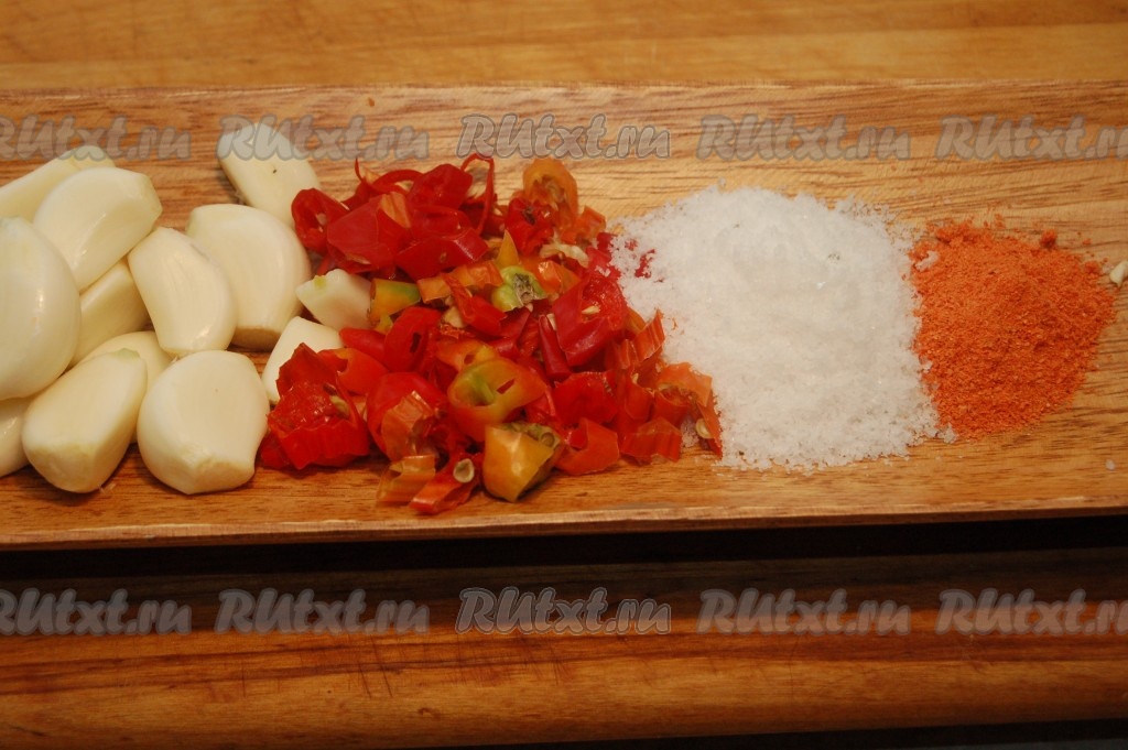 Смешаем воду с уксусом, выльем в капусту, перемешаем, добавим оставшуюся кашицу из специй и еще раз перемешаем.