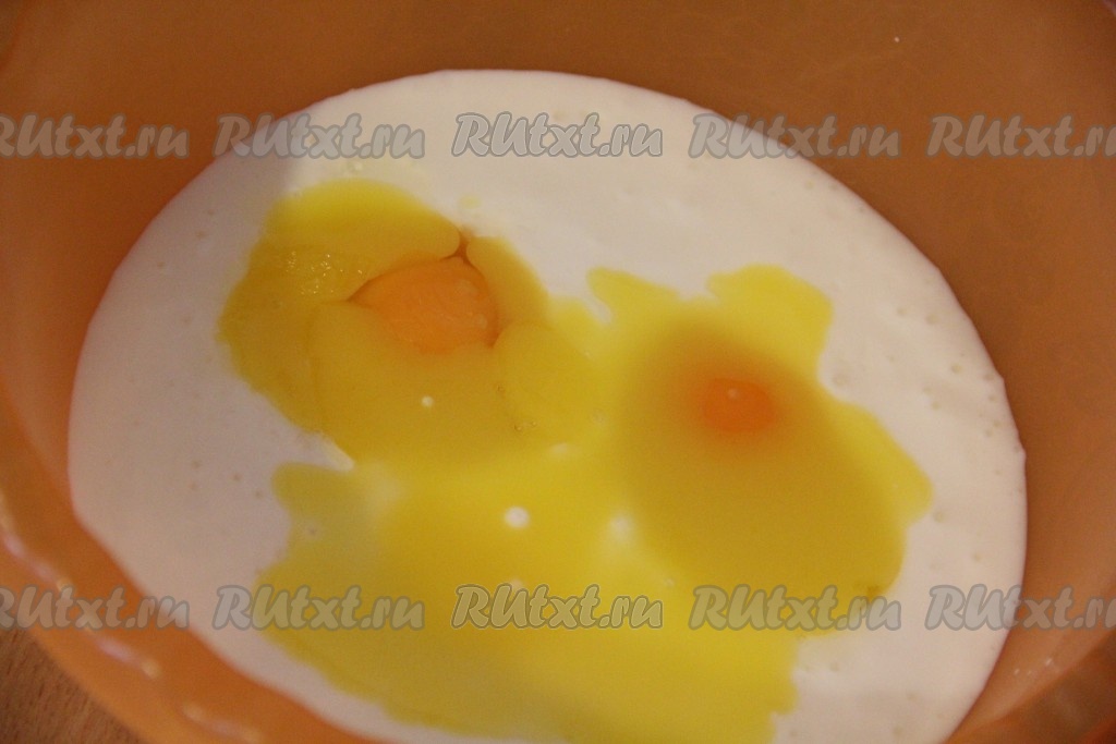 Масло сливочное растопить и слегка остудить. В глубокую миску влить кефир, добавить яйца и сливочное масло. Я замешивала тесто с помощью венчика, но можно перемешивать вилкой. Слегка взбить смесь венчиком.