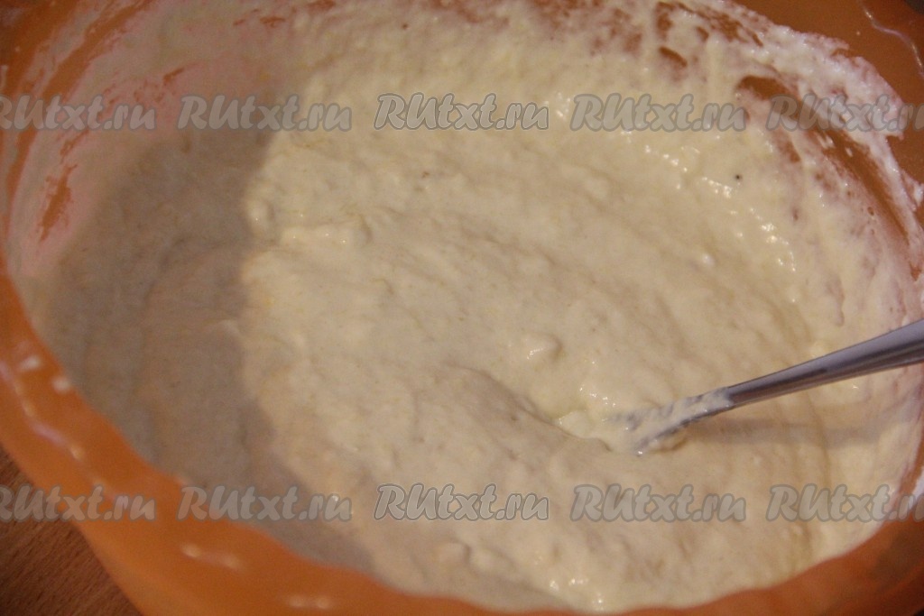 Всё тщательно перемешать до однородного состояния. Тесто получится в меру густым, но не льющимся.