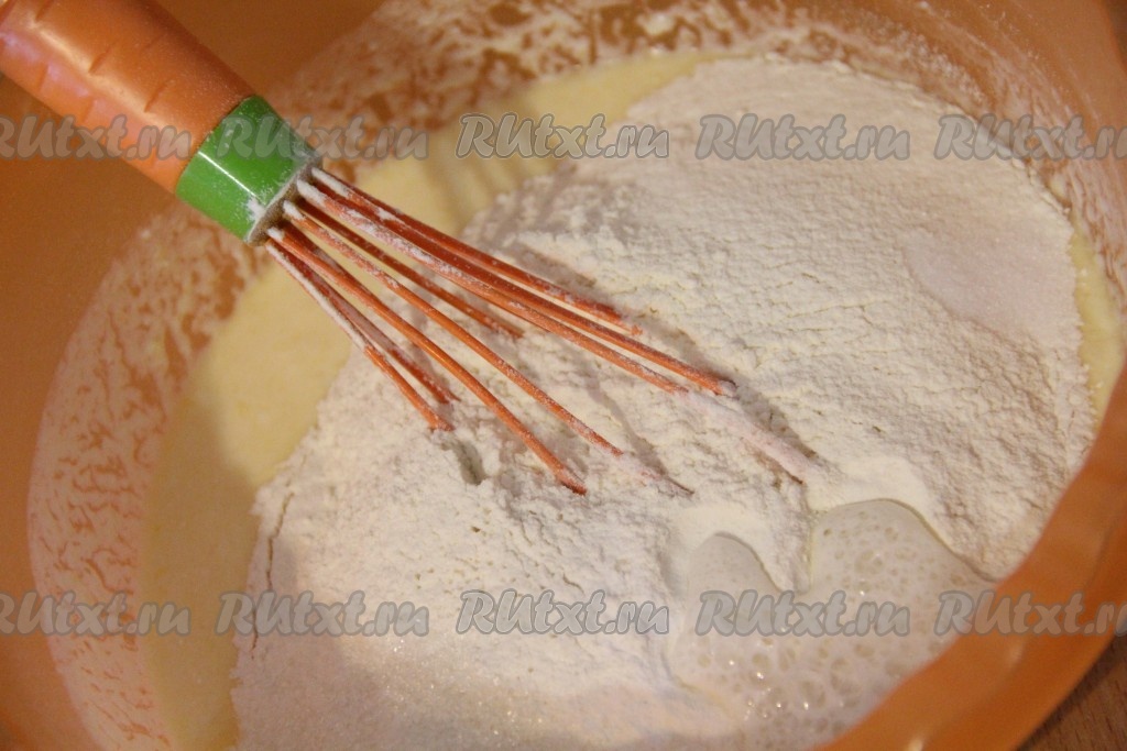 Затем всыпать просеянную муку. Добавить соль, сахар и разрыхлитель. Соду погасить лимонной кислотой или уксусом. Добавить соду в тесто.