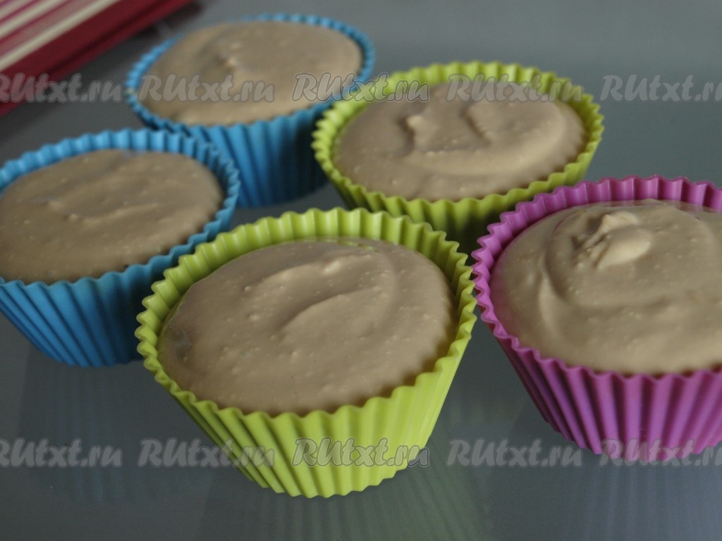 В глубокую миску выложить творог и сгущённое молоко. Взбить блендером или миксером до однородной массы. Затем влить молоко и ещё раз хорошо взбить. Разложить получившуюся массу по силиконовым формочкам для кексов.