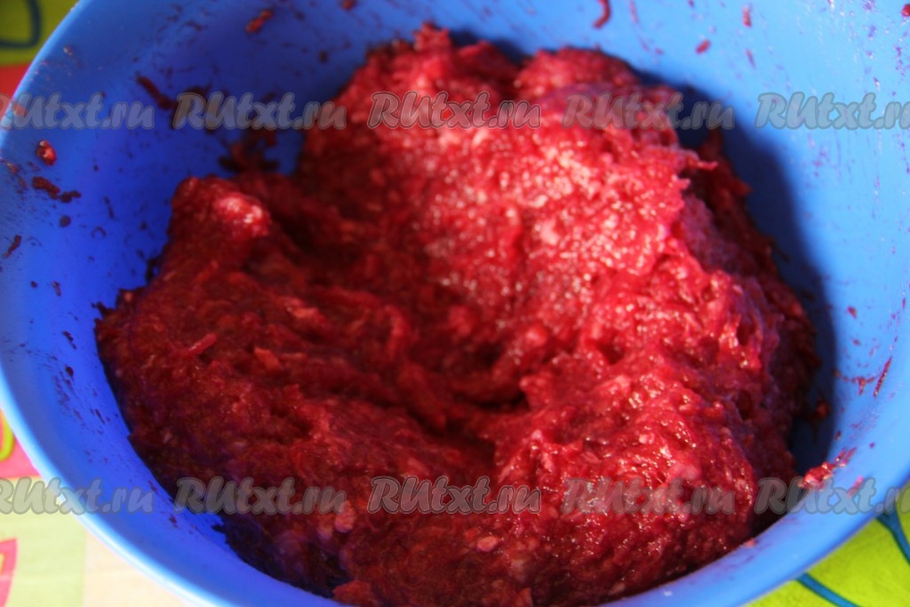 Отварной картофель и свеклу натереть на мелкой терке. Яйцо, натертые овощи, соль и перец добавить к мясному фаршу.
