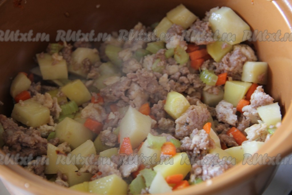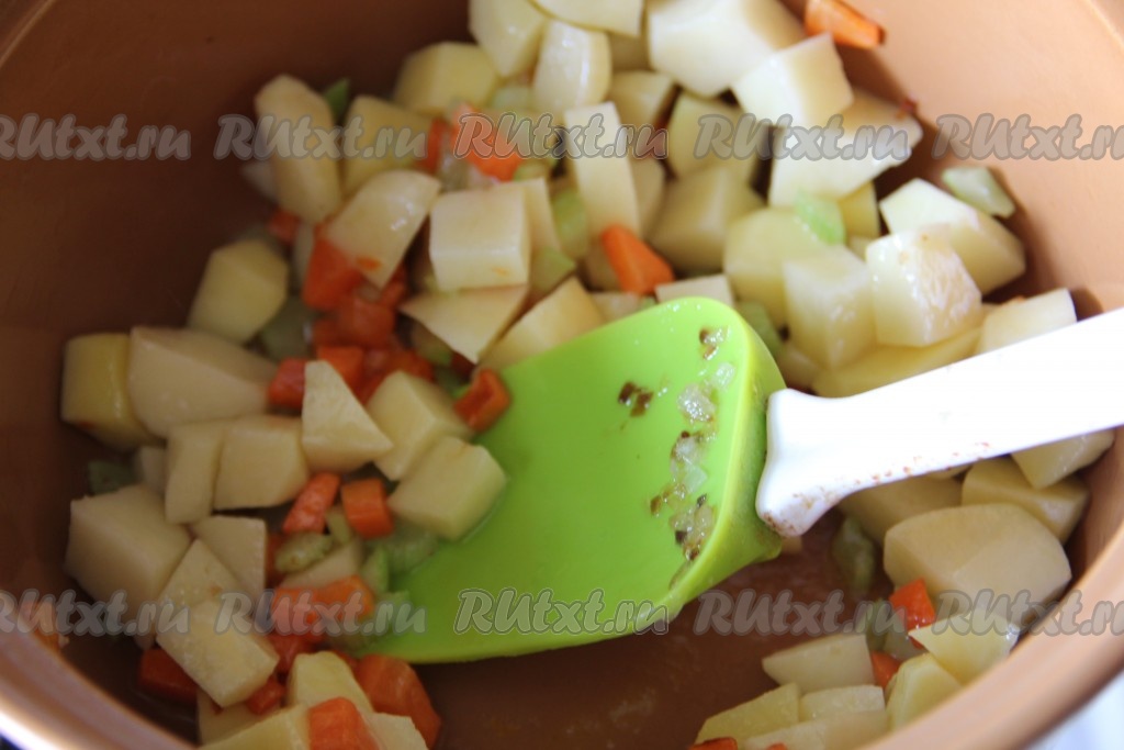 Отдельно в кастрюле обжарить на растительном масле в течение 5 минут лук, морковь и сельдерей, нарезанные кубиками, затем добавить нарезанный кубиками картофель и держать на огне еще 3 минуты.