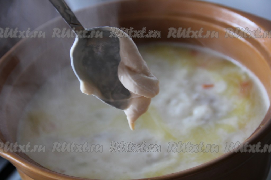 Если необходимо, можно добавить соль, пропущенный через пресс чеснок, порезанную зелень, дать сырному супу с фаршем закипеть и выключить огонь.