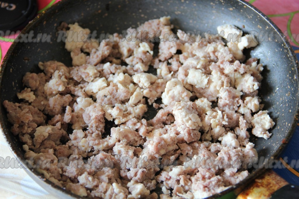 Мясной фарш обжарить на растительном масле, помешивая, до готовности (до изменения цвета фарша), посолить и поперчить.
