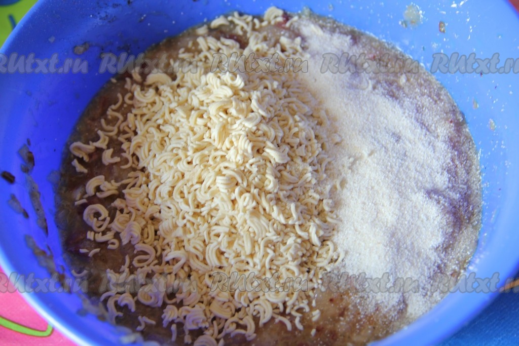 К полученной массе добавить манку и измельченную лапшу быстрого приготовления (или вермишель "паутинка").