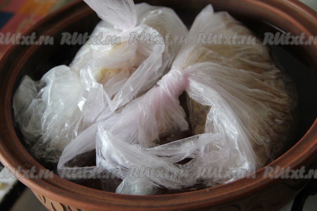Каждую часть переложить в пакет, сформировать колбаски и завязать пакет. Далее каждый пакет поместить ещё в один пакет и хорошо завязать. Опустить наши куриные рулеты в холодную воду и варить 40 минут с одной стороны, затем перевернуть и варить 40 минут с другой стороны.