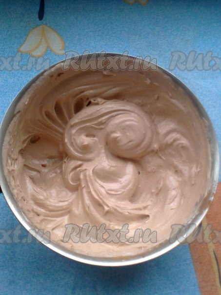 Всыпаем натёртый шоколад в белковую массу. Вымешиваем массу ложкой или силиконовой лопаткой. Еще немного взбиваем миксером.