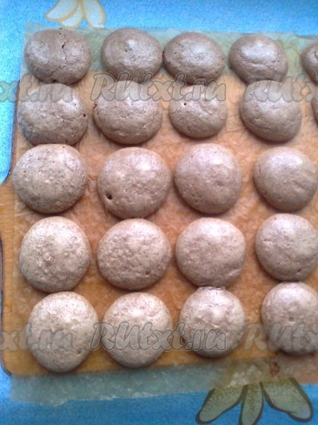 Противень необходимо выстелить пергаментом для выпечки. Можно смазать пергамент маслом. С помощью кондитерского мешка с круглой насадкой выкладываем белково-шоколадную массу кружочками диаметром 3-5 см (можно воспользоваться чайной ложкой), оставляя расстояние между ними.