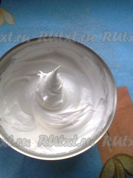 постепенно всыпаем весь сахар, не прекращая взбивания. Взбиваем до устойчивых крепких пиков,