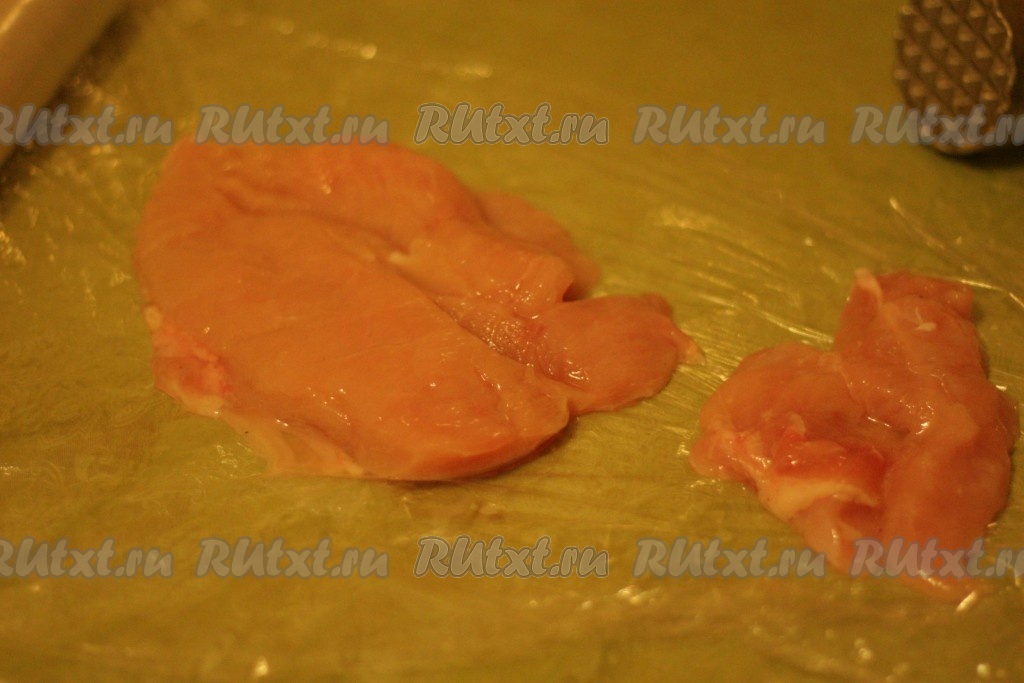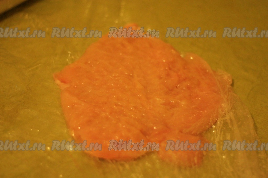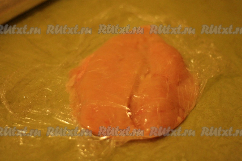 Куриное филе раскрыть, как книгу, положить между двумя слоями пищевой пленки.
