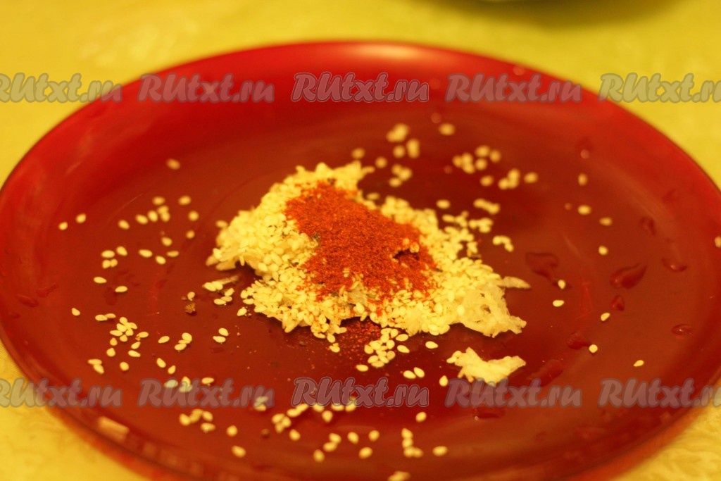 Смешать кунжут, паприку, соль, перец и оставшийся чеснок (также натереть).