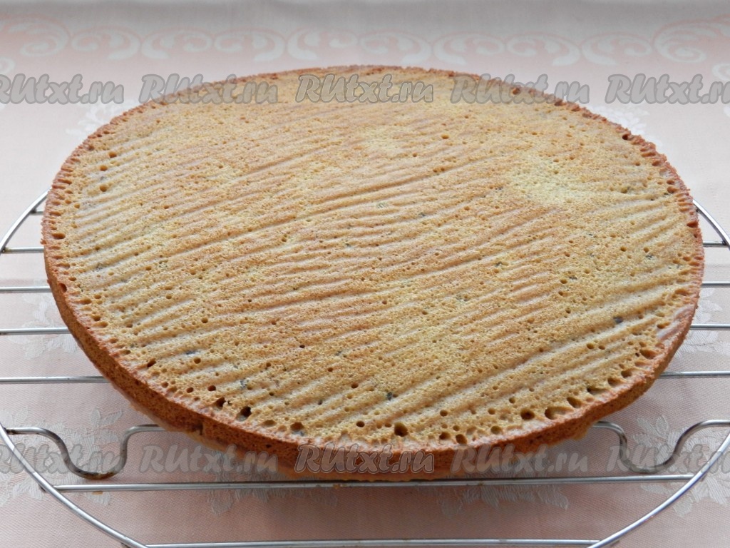 Готовый корж выложить на решетку остывать и приготовить второй корж из оставшегося теста. Коржи остудить.