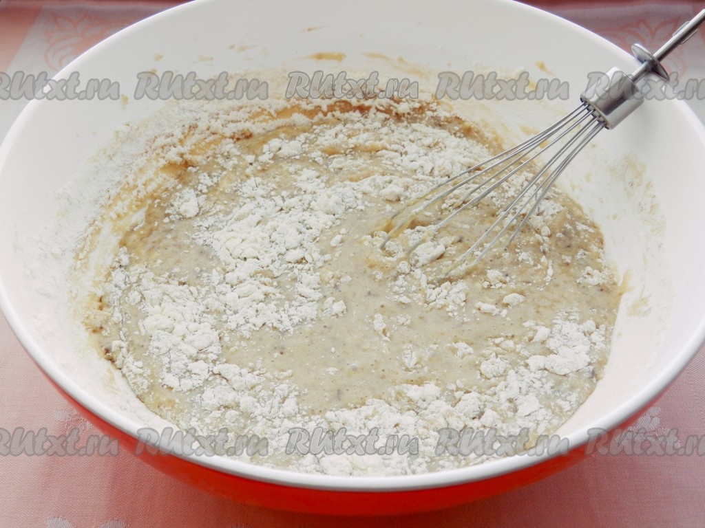 Добавить яйца в смесь кефира и варенья, перемешать. Постепенно добавить муку. Взбить все вместе, чтобы смесь была однородной.