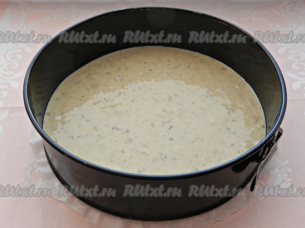 Форму для выпечки смазать растительным маслом. Вылить половину теста и поставить в разогретую до 180 градусов духовку на 25 минут.