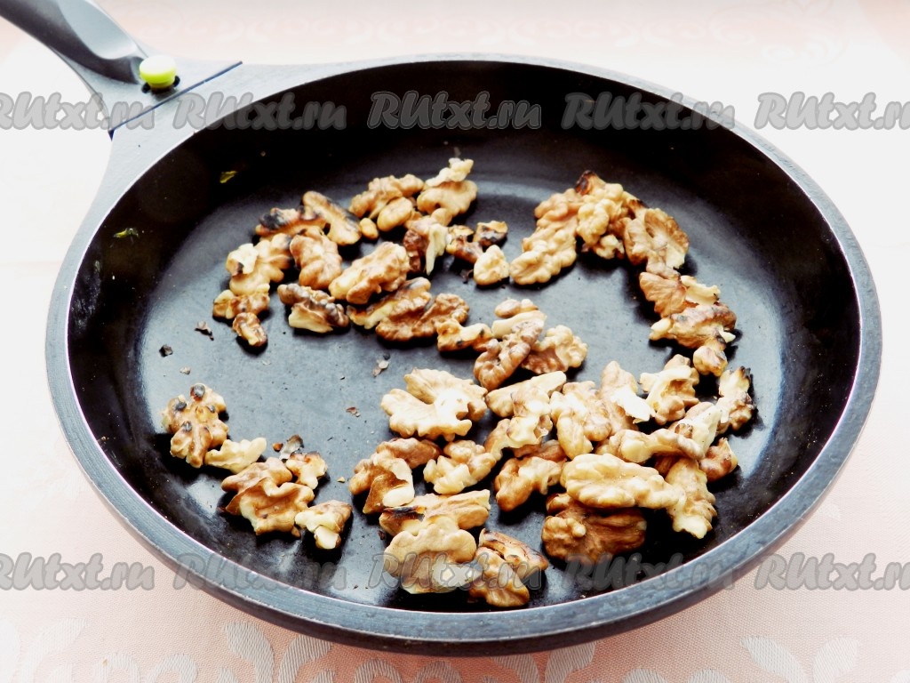 Орехи поджарить на сухой сковороде и измельчить.