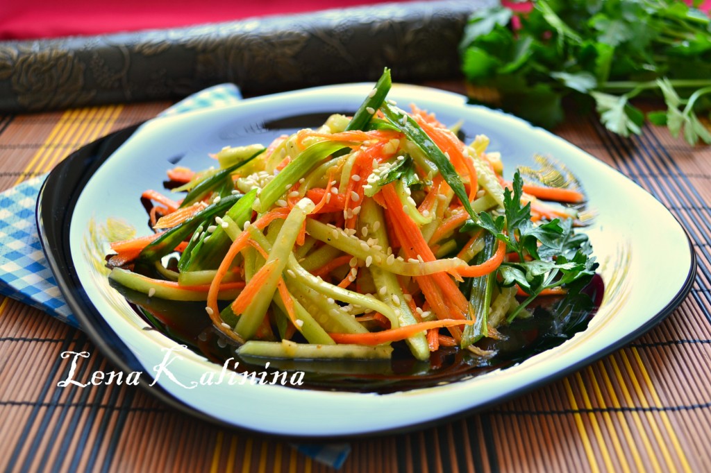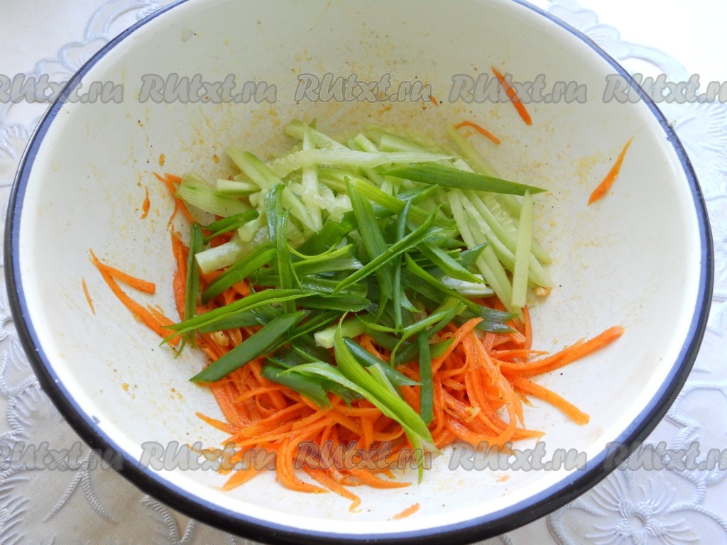 Хорошо морковь перемешать и оставить на 10-15 минут. Огурец свежий очистить и порезать тонкой соломкой, перья зеленого лука порезать длинными полосочками (длиной по 4-5 см). Огурчик и лук добавить к моркови.