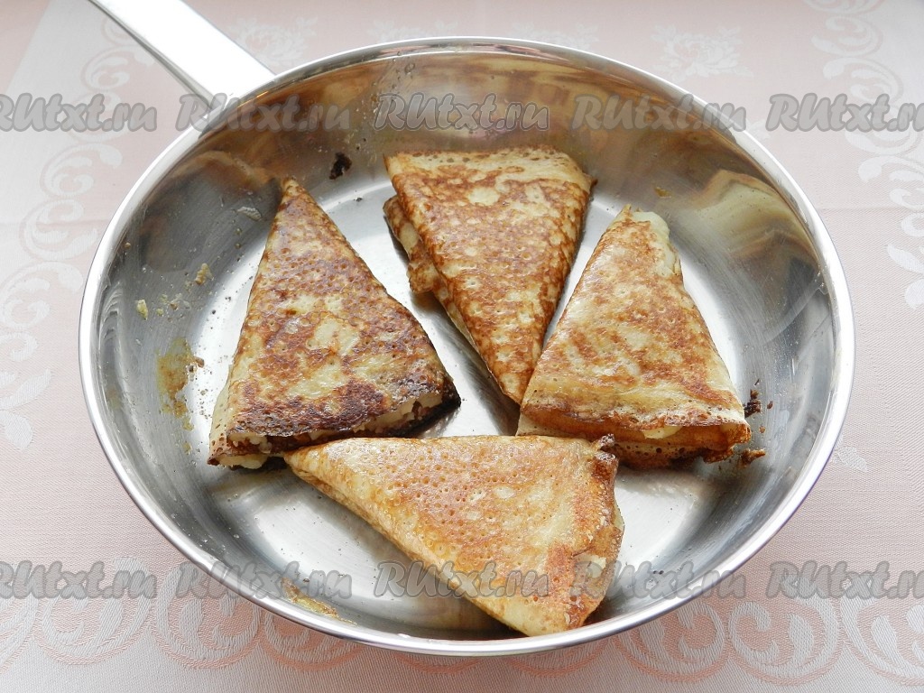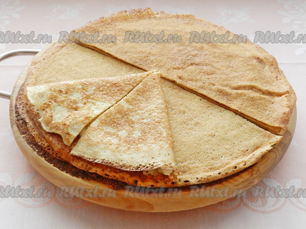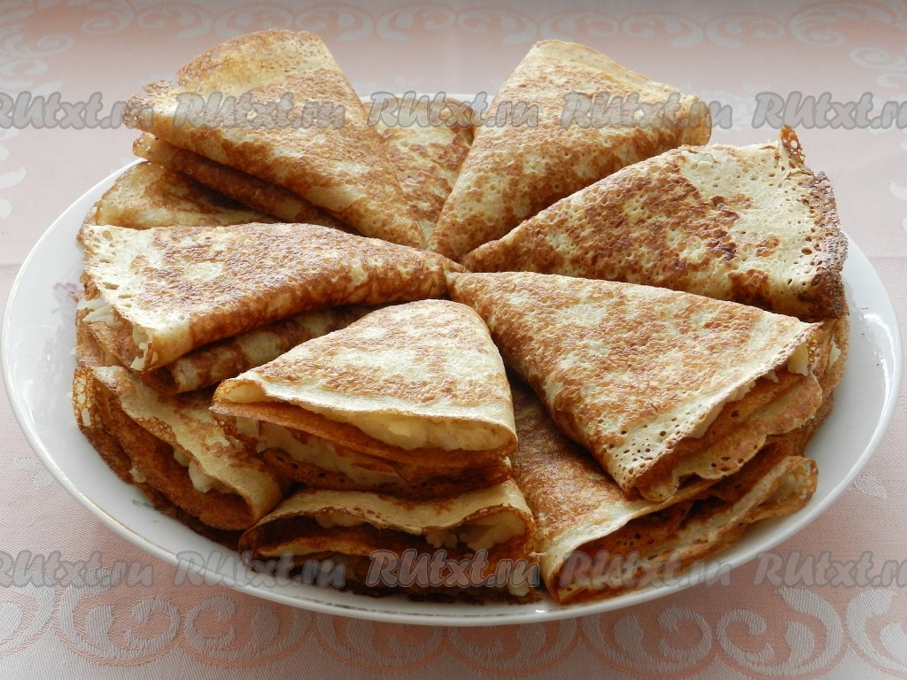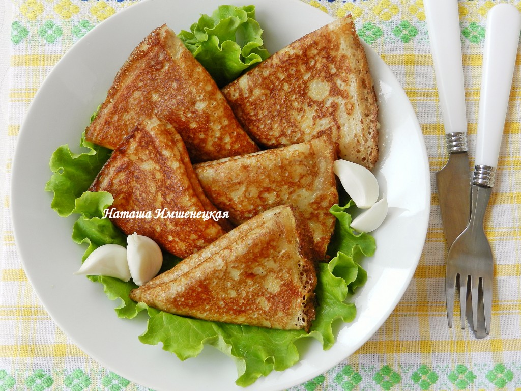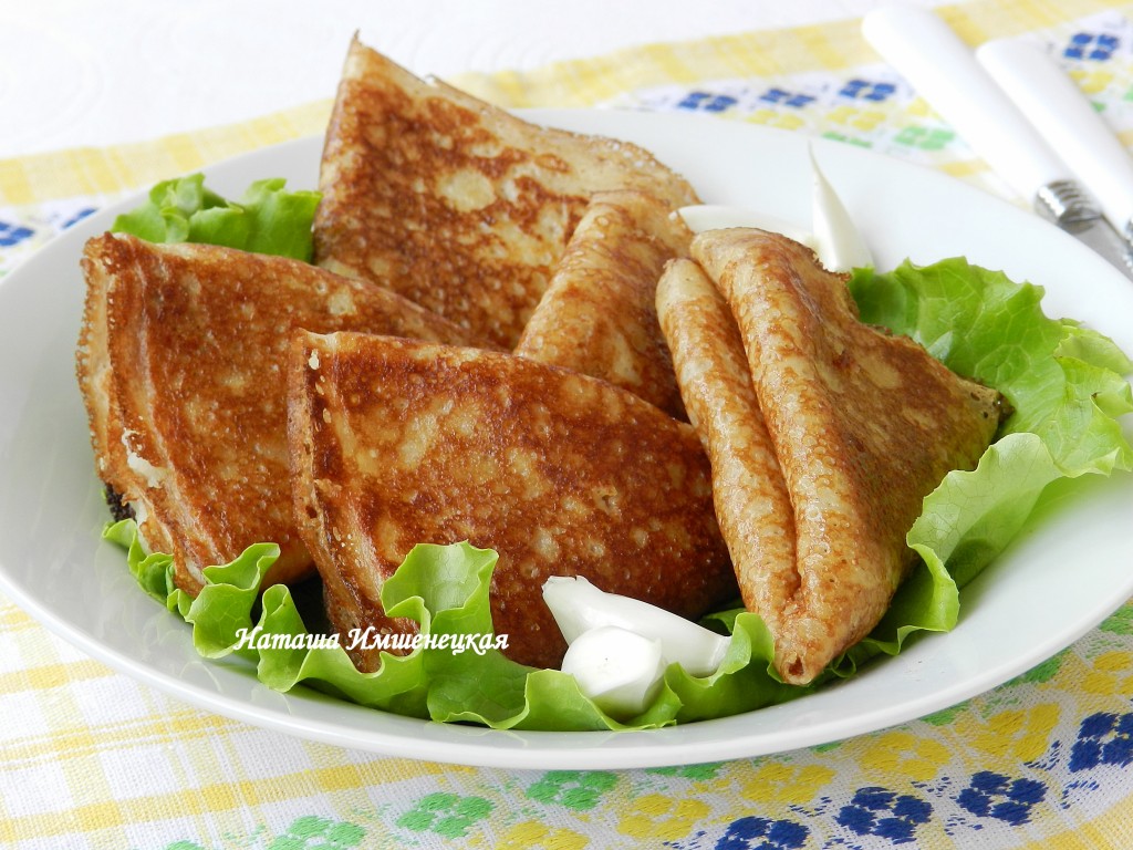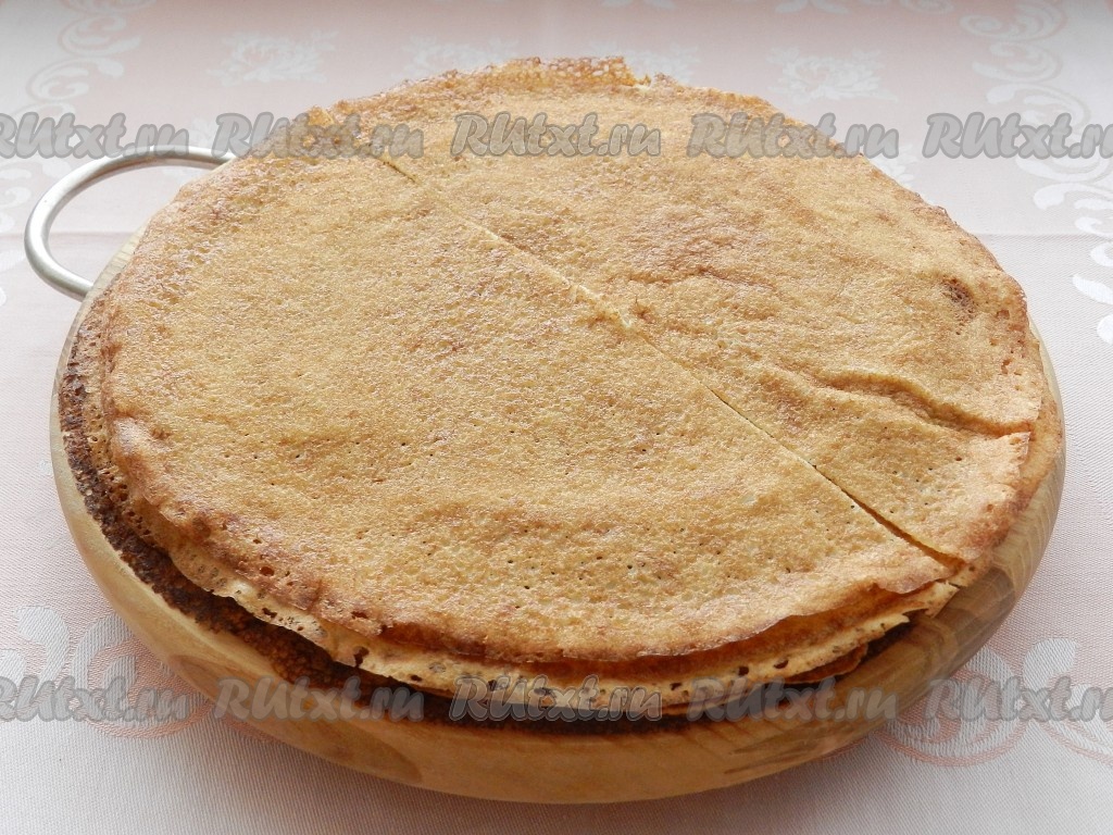 Блины приготовить по своему любимому рецепту. Я готовила блины на простокваше, можно использовать рецепт блинов на топлёном молоке или другой. Блины разрезать пополам.