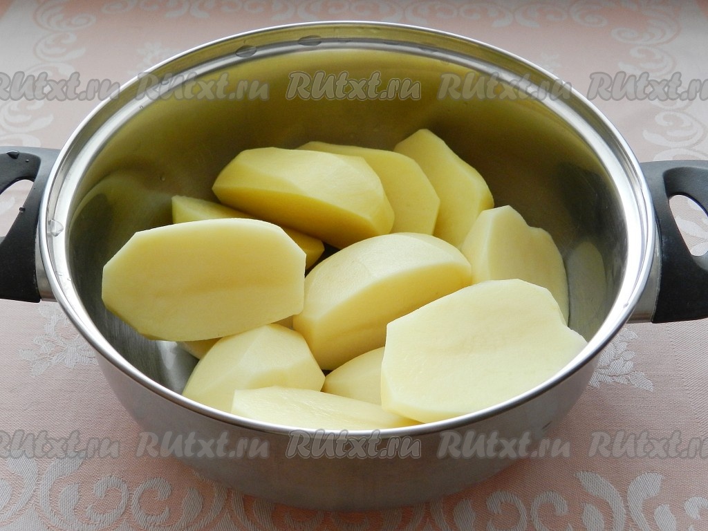 Очищенный картофель отварить в подсоленной воде до готовности (на варку потребуется минут 20-25 с момента закипания воды), затем воду слить.